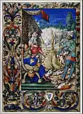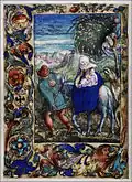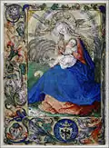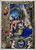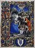 ![]() Zwiastowanie pasterzom (fol. 65v) z postacią wzorowaną na Dudziarzu Dürera (1514)[2] i herbem właścicielki manuskryptu (Wężem Sforzów) | |