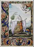 Ostatnia miniatura w Modlitewniku królowej Bony odbiega charakterem od pozostałych iluminacji, nawiązując stylizacją szat postaci i konserwatyzmem ujęcia tematu do późnogotyckich dzieł krakowskiego cechu malarzy[81]. Centralną figurą przedstawienia jest Maryja, wokół której zgromadziło się jedenastu apostołów[82], w tym dwóch (Jan i Piotr) potraktowanych odmiennie i zasiadających obok Matki Bożej. Nad głowami zgromadzonych unosi się Duch Święty pod postacią gołębicy, wyróżniony eliptyczną, tęczową aureolą[81]. W bordiurze zastosowano dekorację z liści akantu i girlandę kwiatową. Wśród ornamentów umieszczono medalion z udostojnieniem herbu książąt Mediolanu (Orłem Viscontich)[69]. |