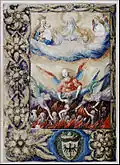 Malując rzadko przedstawianą w modlitewnikach scenę uwalniania dusz czyśćcowych przez anioły, Samostrzelnik wykorzystał motywy zaczerpnięte z dwóch dzieł artystów niemieckich, które powstały w roku 1515 – drzeworytu Hansa Süssa z Kulmbachu (Wieniec różany) i rysunku piórkiem autorstwa Dürera w Modlitewniku Maksymiliana I (Czyściec)[77]. Trójcę Świętą w górnej części iluminacji przedstawiono pod postaciami Ojca (Stwórcy) z kulą ziemską, Ducha Świętego (Nauczyciela) i Dzieciątka w ramionach Maryi. Matka Boska w typie Mulier amicta sole, w cesarskiej koronie na rozpuszczonych włosach i z berłem, pełni funkcję pośredniczki i wspomożycielki[78]. Wymowa miniatury, odwołującej się do nauki kościelnej dotyczącej doczesnych kar za grzechy i możliwości uwalniania dusz czyśćcowych od mąk, ma charakter antyreformacyjny[79]. W bordiurze zastosowano dekorację z suchych girland splecionych z rozetami, wśród których umieszczono ludzką czaszkę – otaczające ją uschnięte pąki kwiatowe kryją sygnaturę artysty S C P I (łac.Stanislaus Claratumbensis Pictor Indignus). Obok motywów wanitatywnych w bordiurze pojawiają się żołędzie symbolizujące siłę moralną[39]. |