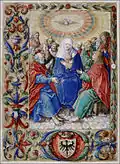 Kompozycja sceny głównej wzorowana jest na powstałym w roku 1513 drzeworycie Albrechta Altdorfera z cyklu Upadek i odkupienie rodzaju ludzkiego. Wprowadzone przez Samostrzelnika zmiany silniej wyeksponowały postać Maryi na tle zrujnowanego Domu Dawida, podwyższyły linię horyzontu i zmieniły pierwszy plan przedstawienia[55]. Malarz wyeksponował mistyczny sens sceny, podkreślając podwójną naturę Dzieciątka i eucharystyczną symbolikę jego ciała (Christus immolatus)[56]. Scena główna, dla której wzorem były przedstawienia charakterystyczne dla szkoły naddunajskiej, została ujęta w renesansową ramę wzorowaną na dziełach włoskich. Wśród motywów floralnych wyróżnia się ukoronowana tarcza herbowa z Wężem Sforzów, otoczona wieńcem laurowym[57]. |