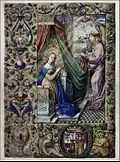Wzorem ikonograficznym mógł być drzeworyt Zwiastowanie Hansa Baldunga Griena z 1514 roku bądź jedna ze scen zwiastowania autorstwa Albrechta Dürera, jednak pierwotna kompozycja została znacznie przetworzona. Archanioł Gabriel odsłaniający kotarę nad klęczącą Maryją i wielkie okno z widokiem na rozległy krajobraz to elementy zaczerpnięte z niemieckich grafik, natomiast gęsto pokrywający meble i framugę okienną ornament jest pochodzenia włoskiego[52]. Zastosowane motywy ikonograficzne odwołują się do koncepcji niepokalanego poczęcia Maryi oraz interpretacji wcielenia jako zaślubin Oblubieńca (Boga) z Oblubienicą (Kościołem uosabianym przez Maryję) z Pieśni nad pieśniami[53]. Na stopniu klęcznika artysta umieścił swoją sygnaturę i datę wykonania miniatury: S. C. f. A°. MDXXVII (łac. Stanislaus Claratumbensis fecit Anno 1527). W bordiurze zastosowano arabeskę roślinną na złotym tle. Umieszczone wśród ornamentów putta w laurowych wieńcach podtrzymują medalion z czteropolową tarczą herbową królowej Bony[52]. |