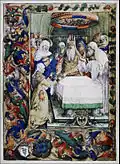 | Małe oficjum o Matce Bożej | 37r–113r | Tekst Officium Beate Marie Virginis secundum consuetudinem Romane curie jest uproszczonym oficjum maryjnym w wersji brewiarzowej, w układzie typowym dla kurii rzymskiej[19]. Każdą horę zamykają specjalne modlitwy do Wszystkich Świętych (suffragia). Kończąca oficjum parafraza modlitwy Ave Maria została uaktualniona pod wpływem wydarzeń związanych z reformacją i zawiera prośbę o zachowanie czystości nauki katolickiej, czyniąc z Matki Bożej strażniczkę wierności królowej wobec Kościoła[20]. Z tekstem małego oficjum o Najświętszej Marii Pannie łączy się cykl miniatur ze scenami z jej życia[21], od zwiastowania (fol. 36v) po rzeź niewiniątek (fol. 87v)[22]. |