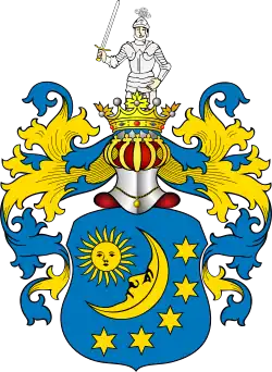 W polu błękitnym u góry z prawej słońce z twarzą złote, w środku takiż księżyc z twarzą, w prawo, z lewej i u dołu pięć gwiazd złotych w półokrąg. Klejnot: nad hełmem w koronie mąż zbrojny z mieczem wzniesionym do cięcia. Labry błękitne, podbite złotem.