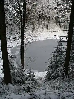 Misa jeziorna o kształcie nieznacznie owalnym jest zamknięta od północy wałem rumowiskowym. Brzegi (zwłaszcza południowy) są strome i zasypane gruzem, częściowo pokryte gliniastą glebą i miejscami zarastające roślinnością. Dno jest muliste, a pod południowym brzegiem wypływa kilka drobnych źródełek zasilających zbiornik. Odwodnienie stawu stanowi system dennych szczelin przy północnym brzegu.