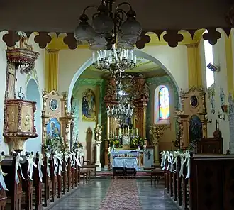 Sufit świątyni jest drewniany, o wymiarach 30m×9m. Ks. Stanisław Godzwon ufundował wewnątrz posadzkę marmurową, a w 1992 roku – staraniem ks. Jerzego Rybusińskiego – wzmocniono rysujące się fundamenty kościoła, ankrowano prezbiterium oraz pomalowano wnętrze świątyni.