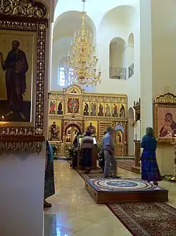 Pierwsza kamienna świątynia w kompleksie klasztornym powstała w 1882 i została poświęcona rok później, pod wezwaniem Spotkania Matki Bożej i Świętej Elżbiety (święto to zostało ustanowione w Rosyjskim Kościele Prawosławnym w związku z utworzeniem tegoż klasztoru, dzięki specjalnym staraniom archimandryty Antoniego). Następnie patronką cerkwi została Kazańska Ikona Matki Bożej – w monasterze przechowywana jest jej kopia czczona jako cudotwórcza[1]. Wyposażenie obiektu zostało przywiezione z Rosji. Ikonę Chrystusa w koronie cierniowej dla ikonostasu napisał sam archimandryta Antonin. Na terenie monasteru znajduje się kamień, przy którym według tradycji nauczał Jan Chrzciciel, oraz kolumna z domu świętych Zachariasza i Elżbiety[1].