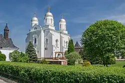 Główną świątynią klasztoru jest sobór Zaśnięcia Matki Bożej, którego współczesny wygląd został w II połowie XX wieku zrekonstruowany tak, by oddać jego pierwotną architekturę z przełomu XIV i XV wieku, z wprowadzenie elementów bizantyjsko-ruskich[29]. Jest to trójnawowa świątynia typu bazylikowego[29] zwieńczona pięcioma złoconymi kopułami położonymi na bębnach, w których znajdują się po cztery półkoliste okna z ozdobnymi obramowaniami. Konstrukcja ścian cerkwi wspiera się na przyporach. Między nimi położone są po dwa okna o analogicznej formie, jak na bębnach. Fasada świątyni wykończona jest szczytem w kształcie oślego łuku. Wejście do budynku prowadzi przez wysunięty przedsionek[30]. Przed I wojną światową rozmieszczenie kopuł było nieco inne: trzy cebulaste kopuły na okrągłych bębnach wieńczyły szczyt głównej elewacji[19] Całość opasuje gzyms[29]. We wnętrzu znajduje się dziewiętnastowieczny trzyrzędowy ikonostas. Sobór jest miejscem przechowywania szczególnie czczonych w monasterze ikon Matki Bożej i św. Mikołaja[31].