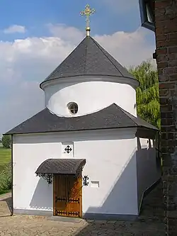Najstarszą cerkwią w kompleksie monasteru jest cerkiew Trójcy Świętej. Pierwotnie wzniesiona w formie rotundy, została powiększona w czasie prac renowacyjnych w II połowie XIX wieku. Zmieniono wówczas dach kryty gontem na blachę, zmodyfikowano kształt okien[32]. Obecnie jej nawa wzniesiona jest na planie prostokąta, do którego przylega półkoliste prezbiterium. Stożkowe dachy ponad nawą i prezbiterium są zwieńczone złoconymi krzyżami. Cerkiew posiada jedynie pojedyncze, półkoliste i prostokątne, wąskie okna. We wnętrzu znajduje się wyposażenie współczesne: marmurowy, jednorzędowy ikonostas oraz zespół fresków wykonanych w stylu neobizantyjskim[33].