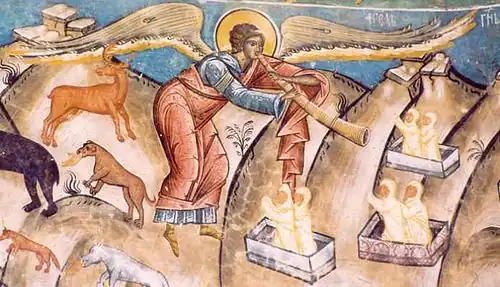 Na najwyższym poziomie fresku, bezpośrednio pod dachem, znajduje się przedstawienie Boga Ojca (jako Starca Dni), po którego bokach anioły zwijają niebo (znak końca czasu, który jest na owym zwijanym niebie reprezentowany dwunastoma znakami zodiaku), dalej zaś znajdują się archanioły.