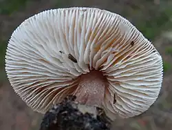 Blaszki białe, tylko u góry krótko przyczepione i dlatego wyglądające prawie jak wolne[5].