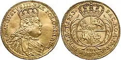 Bile w 1760 r. monety złote z datą 1755 zawierały tylko 7 karatów złota. Produkcją zajmowały się firmy Ephraim & Söhne oraz Moses Isaac & Itizig, których konsorcjum dzierżawiło za wyśrubowany czynsz mennicę pleißenburską, Na monetach znajdował się portret Augusta III oraz daty roczne począwszy od 1753. Mennica pozostawała w pruskich rękach do pokoju w Hubertusburgu (15 lutego 1763 r.), a jej wyroby ściągano przez kolejne trzy lata, przebijając na nową, monetę saską bitą według stopy konwencyjnej[15].