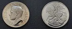 - – awers: Zachowane egzemplarze tej monety mają na awersie portret Edwarda VIII – głowa króla jest odkryta (bez korony) i przedstawiona z lewego profilu[77][78][79]. Pod portretem widnieją niewielkie inicjały HP autora awersu, Humphreya Pageta[77][79]. Wokół głowy króla, wzdłuż krawędzi awersu, biegnie zapisana skrótowo inskrypcja łacińska EDWARDVS VIII D: G: BR: OMN: REX F: D: IND: IMP.[77][78][79]