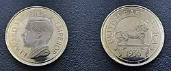 - – awers: Zachowane egzemplarze tej monety mają na awersie portret Edwarda VIII – głowa króla jest odkryta (bez korony) i przedstawiona z lewego profilu[63][64][65]. Pod portretem widnieją niewielkie inicjały HP autora awersu, Humphreya Pageta[63][65]. Wokół głowy króla, wzdłuż krawędzi awersu, biegnie zapisana skrótowo inskrypcja łacińska EDWARDVS VIII D: G: BR: OMN: REX F: D: IND: IMP.[63][64][65]