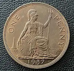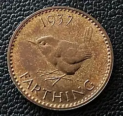 - – rewers: Rewers monety posiada nowy wzór, różniący się od tego widniejącego na wcześniejszych monetach tego typu[66]. Zamiast siedzącej Britannii jest tu bowiem wizerunek strzyżyka[30][66]. Uważany jest on powszechnie za najmniejszego brytyjskiego ptaka i uznano za stosowne, aby to właśnie on stał się symbolem monety o najmniejszej wartości[30]. Strzyżyk zwrócony jest w lewą stronę, a za nim widnieje niewielki monogram HWP oznaczający Harolda Wilsona Parkera, autora wzoru rewersu[64][65]. Ponad ptakiem umieszczona jest data 1937, a pod ptakiem napis FARTHING[64][65]. Po abdykacji Edwarda VIII rewers ze strzyżykiem zaadaptowany został na farthingach jego następcy, Jerzego VI[67].