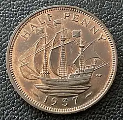 - – rewers: Rewers monety posiada nowy wzór, różniący się od tego widniejącego na wcześniejszych monetach tego typu[80]. Zamiast tradycyjnego wizerunku siedzącej Britannii przedstawiono tu bowiem lewą burtę trzymasztowego statku płynącego z rozwiniętymi żaglami po morzu[78][79][80]. Przyjmuje się, że statek ten reprezentować ma Złotą Łanię („Golden Hind”), okręt flagowy Francisa Drake’a[77][80]. Za statkiem umieszczone są inicjały HP oznaczające Humphreya Pageta, projektanta rewersu[77][79]. Ponad statkiem widnieje napis HALF PENNY, a pod statkiem jest data 1937[78][79]. Po abdykacji Edwarda VIII rewers ze statkiem zaadaptowany został na półpensach jego następcy, Jerzego VI[81].