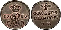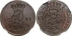- ↑ Czesław Kamiński, Janusz Kurpiewski, Katalog monet polskich 1764–1864, wyd. II poprawione, Warszawa: Krajowa Agencja Wydawnicza, 1977, s. 60, ISBN 83-03-03103-1.