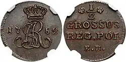 | 10 | ½ grosza | półgrosz | 1/60 | miedź | 1,95 | – | funt koloński |