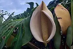 - Kwiatostan w kształcie kolby o długości do 30 cm jest otoczony dużą białą pochwą.