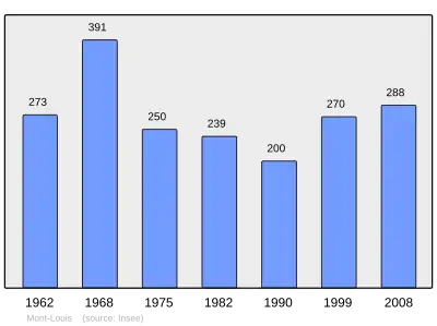 Według danych na rok 1990 gminę zamieszkiwało 200 osób, a gęstość zaludnienia wynosiła 513 osób/km² (wśród 1545 gmin Langwedocji-Roussillon Mont-Louis plasuje się na 709. miejscu pod względem liczby ludności, natomiast pod względem powierzchni na miejscu 1111.).