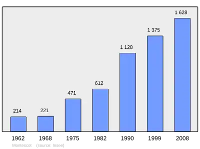 Według danych na rok 1990 gminę zamieszkiwało 1128 osób, a gęstość zaludnienia wynosiła 187 osób/km² (wśród 1545 gmin Langwedocji-Roussillon Montescot plasuje się na 306. miejscu pod względem liczby ludności, natomiast pod względem powierzchni na miejscu 964.).