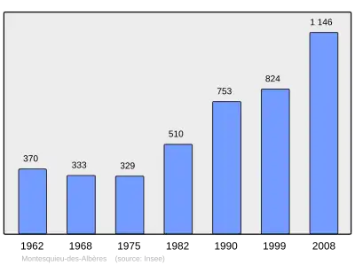 Według danych na rok 2010 gminę zamieszkiwały 1168 osoby, a gęstość zaludnienia wynosiła 68 osoby/km² (wśród 1545 gmin Langwedocji-Roussillon Montesquieu-des-Albères plasuje się na 416. miejscu pod względem liczby ludności, natomiast pod względem powierzchni na miejscu 462.).