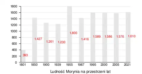 Przed II wojną światową Moryń był zamieszkały przez 1227 osób[9]. Była tu poczta, szkoła podstawowa, apteka, gabinet dentystyczny, dwie gospody, dwie piekarnie, gorzelnia, młyn miejski i wiatrak. Opiekę medyczną nad mieszkańcami sprawowało dwóch lekarzy, pielęgniarka i akuszerka.