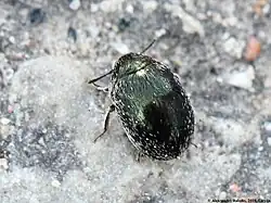 Chrząszcz o owalnym, wydłużonym, mocno wypukłym ciele długości od 3,2 do 4,8 mm. Ubarwienie wierzchu ciała odznacza się zwykle metalicznym połyskiem, jednak jest słabo widoczne ze względu na gęste owłosienie; włosy na tarczce są bardzo gęsto rozmieszczone i mają kolor biały do bladożółtego, wskutek czego wyraźnie kontrastują z owłosieniem reszty wierzchu ciała. Głowa pozbawiona jest szwu czołowo-nadustkowego oraz listewki na przednim brzegu. Punkty na pokrywach są wyraźne, duże i głębokie. Owłosienie pokryw jest rzadsze niż tarczki. Odnóża są krótkie i spłaszczone, a przednia ich para ma na stronach wewnętrznych goleni rowki, w które chować mogą się stopy. Szerokości ud i goleni są prawie takie same[3].