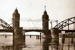 W 1909 roku władze niemieckie miasta postanowiły wybudować most zwodzony. Budowa trwała 3 lata. Projektantem ówczesnego mostu był radca budowlany Benduch. Został on wysadzony przez wycofujące się wojska niemieckie pod koniec II wojny światowej, wiosną 1945.