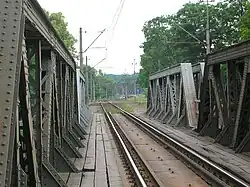 Pierwotnie most był wykonany jako kratownicowy żelazny o długości 54,14 m z dwoma przęsłami zasadniczymi o prześwicie świetlnym po 23,42 m[3]. W 1910 r. oddano do użytku drugi tor linii kolejowej.