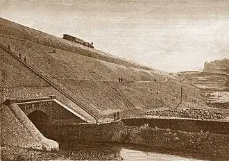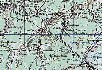 | Drewniany most Wieriebiński. Lata 60. XIX wieku. | Nasyp z przepustem nad rzeką Werebją na trasie objazdu z 1881 r. | Trasa objazdu wieriebińskiego na mapie z 1941 r. |