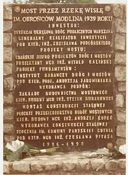 Budowniczych mostu upamiętniono tablicą umieszczoną na cokole przy moście, na prawym brzegu Wisły. Tablicę przedstawia fotografia.