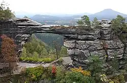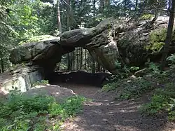 Powstaje na drodze różnych mechanizmów, np. przez zachowanie części stropu jaskini przy zawaleniu się jej pozostałych fragmentów lub przez stopniową erozję podstawy muru skalnego przy zachowaniu jego wyższych partii. Występuje głównie na obszarach zbudowanych ze skał osadowych – piaskowców, rzadziej zlepieńców.