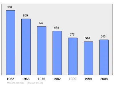 Według danych na rok 1990 gminę zamieszkiwały 573 osoby, a gęstość zaludnienia wynosiła 22 osoby/km² (wśród 747 gmin Limousin Moutier-Malcard plasuje się na 226. miejscu pod względem liczby ludności, natomiast pod względem powierzchni na miejscu 220.).