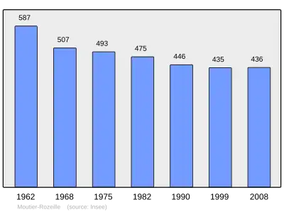 Według danych na rok 1990 gminę zamieszkiwało 446 osób, a gęstość zaludnienia wynosiła 23 osoby/km² (wśród 747 gmin Limousin Moutier-Rozeille plasuje się na 274. miejscu pod względem liczby ludności, natomiast pod względem powierzchni na miejscu 355.).