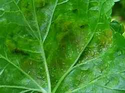 ![]() Liść porzeczki czarnej z żerującymi larwami mszycy porzeczkowo-czyściecowej | |||