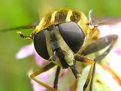 U muchówek dychoptycznych oczy złożone rozdzielone są czołem. Czoło i ciemię stykają się ze sobą i płynnie przechodzą jedno w drugie[1].
