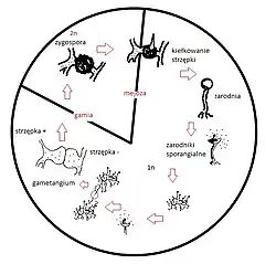 Mucoromycota wytwarzają bezpłciowe sporangiospory i tworzą zygospory powstające przez fuzję morfologicznie podobnych gametangiów. Pilobolus, Mucor i Rhizopus to popularne pleśnie. Wytwarzają grzybnię składającą się z rozgałęzionych strzępek bez sept[2]. Gdy zetkną się dwie odmienne płciowo strzępki (+) i (-), ich ściany rozpuszczają się, zawartość cytoplazmy zlewa się, co nazywa się plazmogamią. W jądrach komórkowych pochodzących od obydwu gametangiów następują podziały mitotyczne, a po nich następuje zlewanie się jąder pochodzących od różnych gametangiów, czyli wielokrotna kariogamia. Powstaje wielojądrowa zygospora o diploidalnej liczbie chromosomów. Otacza się ona grubą ścianą o ciemnej barwie i przechodzi w okres spoczynku. W tym okresie pełni więc funkcję przetrwalnika. Gdy zaczyna kiełkować, zaraz w jej jądrach zachodzi mejoza i powstają jądra haploidalne[3]. Większość gatunków jednak rozprzestrzenia się głównie przez sporangiospory. Pilobolus pod wpływem wybuchowo wzrastającego ciśnienia hydrostatycznego na końcu sporangioforu wyrzuca całe sporangium na odległość do 7 metrów. Jest ono pokryte lepką masą, która przylega do trawy, gdzie jest zjadana przez roślinożercę, a następnie wydalana wraz z odchodami. W tym momencie zarodniki w zarodni zaczynają rosnąć i żerują na odchodach. Zdolność do przenoszenia zarodników z dala od sterty odchodów jest ważna dla taksonów, które dostają się do łajna przez zjedzenie, ponieważ ssaki roślinożerne zwykle nie żerują od razu wokół sterty odchodów[2].