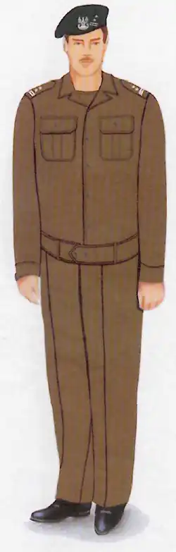 Kurtka i spodnie munduru wyjściowego wykonane są z garbaryny mundurowej w kolorze khaki. Kurtka jednorzędowa z wykładanym kołnierzem i wyłogami, zapinana na cztery guziki. Z przodu umieszczono cztery kieszenie. Kurtka ponadto posiada naramienniki. Na guzikach umieszczono znak orła Wojsk Lądowych[6]. Spodnie długie, bez mankietów zwężane ku dołowi.