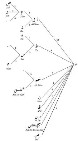 - symbole związane z Kabałą, które odwołują się do pewnych słów kluczowych i fraz w surach, na których początku stoją (Otto Loth, ok. 1881 r.)[3].