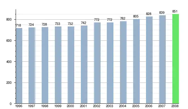 Według danych z dnia 31 grudnia 2012, wieś zamieszkiwały 892 osoby, w tym 442 kobiety i 450 mężczyzn[7].