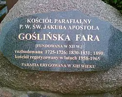 - Rzymskokatolicki kościół parafialny, goślińska fara pw. św. Jakuba, usytuowany na rynku w starej części miasta – powstał w roku 1605. Barokowe prezbiterium pochodzi z 1717 r. i jest dziełem Pompeo Ferrariego. Wewnątrz rzeźby gotyckie, obrazy z XVIII w., na ścianie zewnętrznej renesansowa płyta nagrobna z XVI w. wojewodziny Urszuli z Ostrorogów Lwowskiej, zm. w 1575 r.