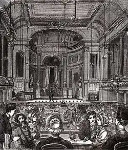 Występy odbywały się w sali muzycznej między widzami-konsumentami. Z czasem performance zostały zamknięte na scenie, a publiczność siedziała za stołami na widowni. Koszty występów pokrywała sprzedaż napojów alkoholowych. Władze brytyjskie starały się zniechęcić do tej formy rozrywki. W 1751 wprowadzono akt prawny wprowadzający wymóg uzyskiwania przez organizatorów licencji. Przepis spowodował efekt przeciwny do zamierzonego przez władze. Mniejsze puby zaczęły szukać sposobów na uniknięcie obowiązku licencyjnego i zamieniały się w kluby muzyczne, które nie podlegały pod wspomniany akt prawny. Z kolei większe tawerny, korzystając z reklamy jako licencjonowany organizator rozrywki, zaczęły dbać o scenografię i zatrudnienie muzyków, by ostatecznie przenieść działalność do bogato zdobionych wnętrz, które umożliwiały osiąganie bardziej efektownych aranżacji widowisk. Miejsce dowolnej popularnej rozrywki określane było jako „saloon”, miejsca przeznaczone na wieczory z mieszanymi zabawami nazywane były „variety” (różnorodność, rozmaitości), zaś „music-hall” stał się określeniem dla sali koncertowej przeznaczonej na występy łączące rozrywkę muzyczną i komiczną[4].
