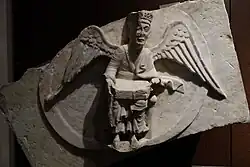 Zachowany we fragmencie cios, przedstawiający anioła, symbol św. Mateusza Ewangelisty, pochodzi z glifu, zdobiącego jeden z romańskich portali bazyliki Santa Maria delle Vigne; pozostałe, niezachowane płaskorzeźby, przedstawiające symbole innych Ewangelistów, były przypuszczalnie rozmieszczone parami wokół centralnego symbolu Agnus Dei. Wysoka jakość kamienia i samego dzieła pozwalają na przypisanie jego autorstwa artyście mającemu związek z budową katedry w Chartres, przybyłego do Genui około roku 1160, w okresie budowy kościoła Santa Maria delle Vigne[12].