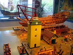 W pawilonach muzeum znajduje się bogata kolekcja eksponatów związanych z tą działalnością. Ekspozycja dedykowana jest pamięci I. M. Stuhra, założyciela stoczni.
