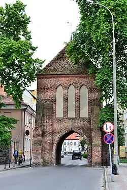 - Obwarowania miejskie – pozostałości kamienno-ceglanych murów obronnych z drugiej połowy XIII w. Pierwotna ich długość wynosiła ok. 1900 m. Wzmocnione były 49 basztami (głównie łupinowymi) rozmieszczonymi co 24–30 m oraz trzema bramami. Do czasów obecnych zachowały się niewielkie fragmenty murów obronnych, dwie bramy oraz dwie baszty (jedna pełna, druga – łupinowa).