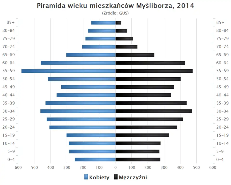 - Piramida wieku mieszkańców Myśliborza w 2014 roku[13].