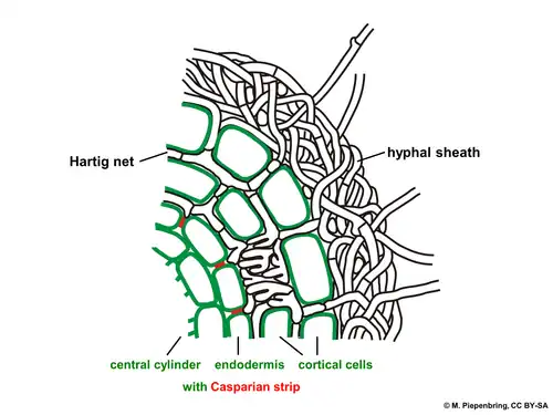 Drugim rodzajem mykoryzy jest ektomykoryza. Zdolnych do tworzenia relacji tego typu jest około 10% rodzin roślin wyższych, głównie są to rośliny drzewiaste[17]. W ektomykoryzie strzępki grzybni oplatają korzenie roślin tworząc tzw. opilśń (mufkę) i wnikają do wnętrza wypełniając przestwory międzykomórkowe, tworząc sieć Hartiga, dzięki czemu mogą przejąć dotychczasowe funkcje włośników, które w takim wypadku zanikają[10]. Grzyby zdolne do tworzenia ektomykoryzy należą do Basidiomycota, Ascomycota i Zygomycota. Relacje typu ektomykoryza charakteryzują się znaczną specyficznością gatunkową, a niektóre gatunki grzybów są zdolne do utworzenia mykoryzy tylko z jednym gatunkiem rośliny[23]. Jednak możliwe jest też tworzenie mykoryzy przez jedno drzewo nawet z 15 gatunkami grzybów jednocześnie[24]. Znane są tysiące gatunków grzybów zdolnych do tworzenia ektomykoryzy a ich całkowitą liczbę szacuje się na 20–25 tys.[25]