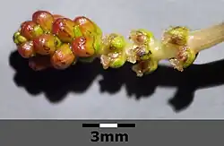 - Jasnoróżowe, niepozorne. Zebrane w wyniesione nad wodę kłosy, co umożliwia anemochorię. Przeważnie obupłciowe, ale także jednopłciowe. Okwiat podzielony na czterodziałkowy kielich (działki szerokotrójkątne o długości i szerokości ok. 0,3 mm) i czteropłatkową koronę (płatki jajowate o długości 2,5 mm). Słupek czteroszyjkowy, pręciki zebrane po osiem. Ułożone okółkowo po 3–4 w kątach przysadek. Dolne przysadki (często z kwiatami żeńskimi) pierzastosieczne o długości kwiatów; górne (często z kwiatami męskimi) całobrzegie, krótsze od kwiatów. Kłos o długości 4–15 cm, wyprostowany, wielkokwiatowy.