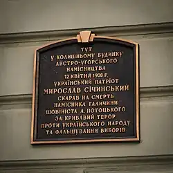 - ↑ На Львівщині дітей навчатимуть героїчному чину Січинського, який застрелив польського намісника. galinfo.com.ua, 2013-06-25. [dostęp 2023-04-16]. (ukr.).