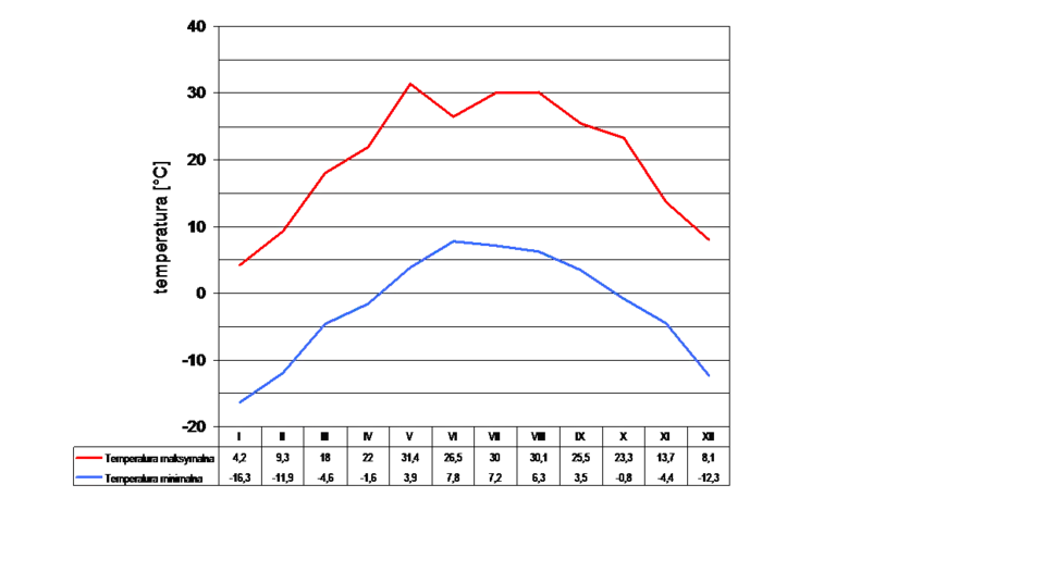 Wykres obrazujący średnie temperatury dobowe, maksymalne i minimalne w ciągu roku dla miasta Myszkowa[10]: